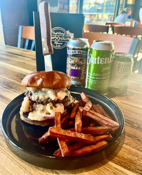 Häus burger, shrimp scampi, Parmesan cheese, red onion, and fresh herbs. Served with Alfredo sauce.