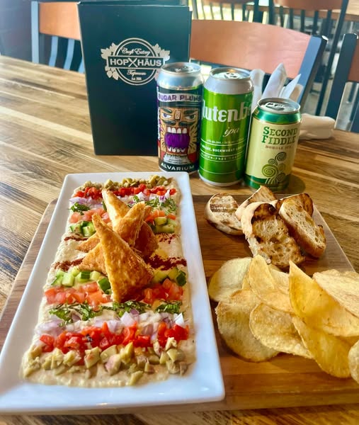 Creamy tahini hummus loaded with red onion, cucumber, tomato, mint, and red peppers served with fried Halloumi, grilled French bread, and Häus crisps.