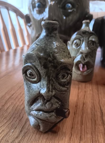 WOW! Scored a group of North Carolina face jugs! Some very nice examples of excellent artist work! Bestoftimesstore strives to get the most unique antique, vintage and unusual items for our shop. BTW, these make GREAT HALLOWEEN decor! Scary, funny and one of a kind!