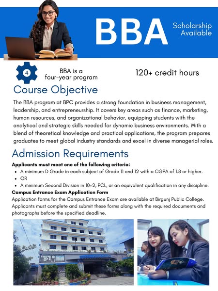 搜索关键词 BBA program, Business Administration, Birgunj College, Purbanchal University, Business Degree, Career Opportunities, Leadership Skills, Management Skills, Finance Marketing, Study BBA优势 Globally recognized degree,Experienced faculty,Practical learning,Leadership skill development,Excellent career opportunities