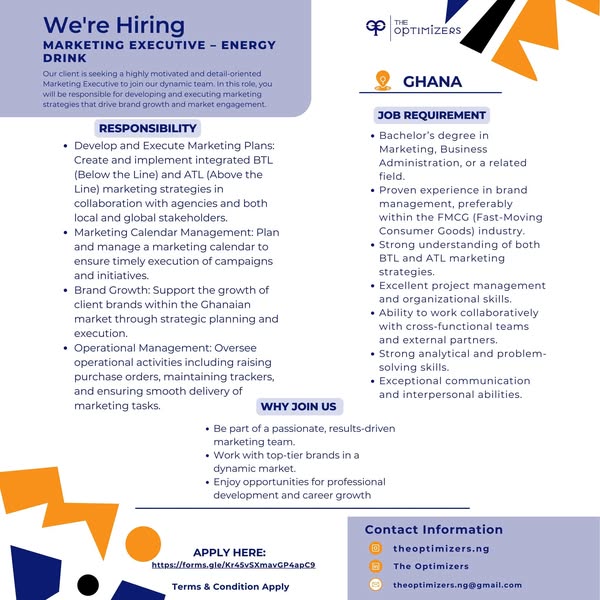 #MarketingJobsGhana #FMCGMarketingGH #GhanaCareers #BrandGrowth #MarketingExecutiveRole #ConsumerMarketing
