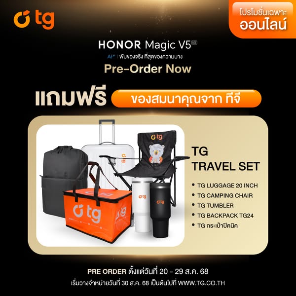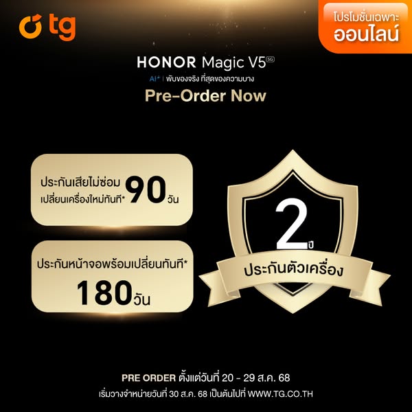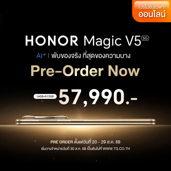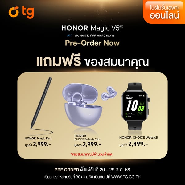 搜索关键词 HONOR Magic V5, foldable smartphone, pre-order offer, Thailand smartphone, smartphone warranty, TG online, HONOR Thailand优势 Thin foldable design,Free gifts worth 32,173 THB,90-day replacement warranty,180-day screen warranty,Pre-order discount