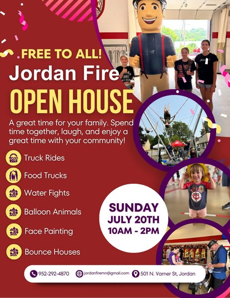 • Jordan Fire Department Relief Association Open House – 501 Varner St N - Sun, Jul 20 | 10:00a - 2:00p