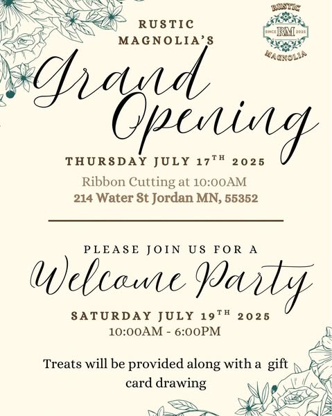 • Rustic Magnolia Grand Opening – 214 Water Street - Thu, Jul 17 | 10:00a - 6:00p