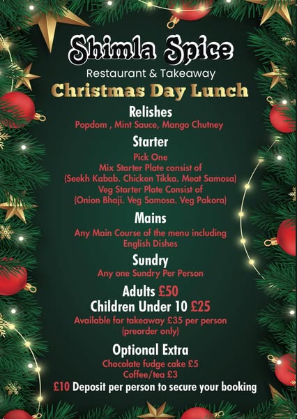 搜索关键词 Christmas Day restaurant, Festive meal offer, Shimla Spice booking, Christmas dinner takeaway, Restaurant special event, 4 course christmas lunch, dubai glamour vegas sparkle, unforgettable family meal, byob christmas dinner, festive cheer优势 Festive atmosphere and decor,4-course meal,BYOB (Bring Your Own Bottle),Vegetarian options available,Takeaway/Delivery service