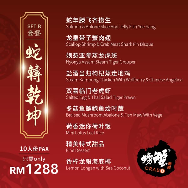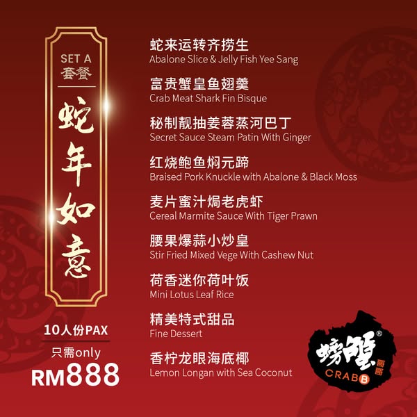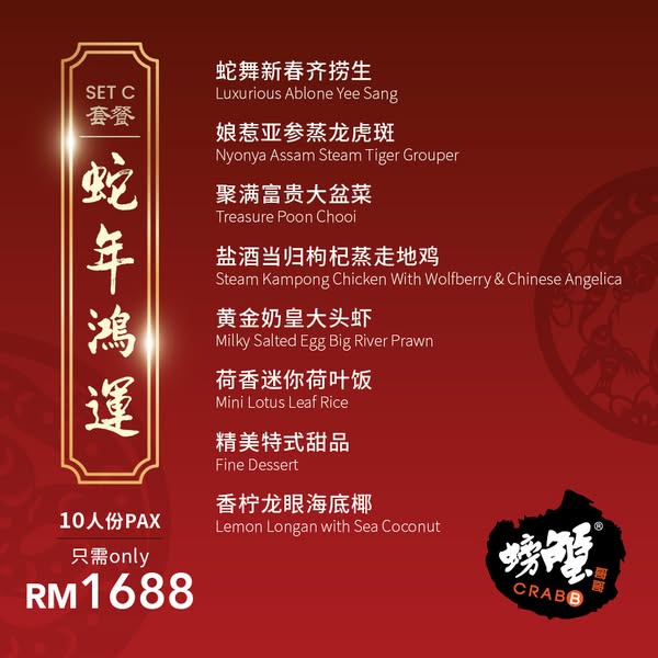 搜索关键词 Chinese New Year Menu, Family Reunion Dinner, CNY Set Menu Malaysia, Crab B Restaurant Puchong, Yee Sang Delivery, Poon Chooi Malaysia, CNY Promotion, Selangor Restaurant, Malaysian Cuisine, Festive Dining优势 春节特色菜肴,多种套餐选择 (A, B, C),包含捞生等吉祥菜品,提供堂食、外送和自取服务,1月15日前下单可享受15%折扣
