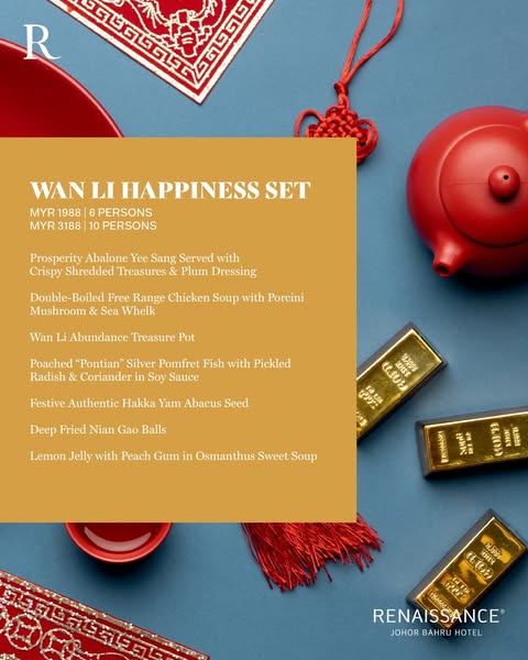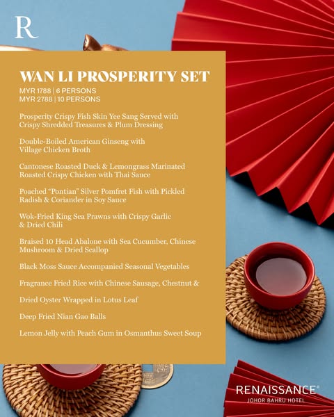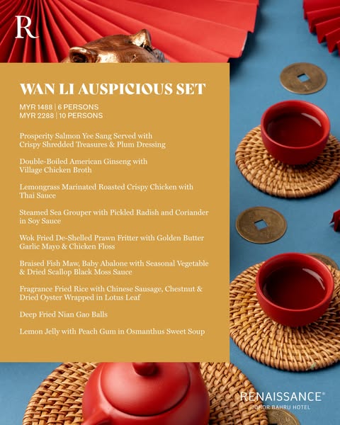 搜索关键词 Wan Li Restaurant, Chinese New Year, Lunar New Year Dinner, Set Menu, Family Reunion, Renaissance JB, Traditional Food, Culinary Delights, Good Fortune, Festive Occasion优势 Traditional culinary delights for Lunar New Year,Specially curated set menus for family gatherings,Symbolic delicacies representing good fortune,Two dinner sessions available