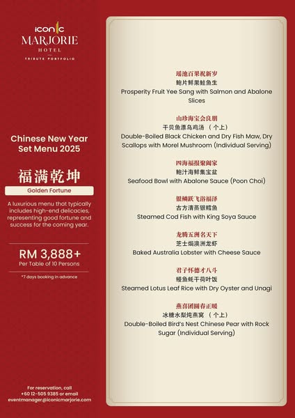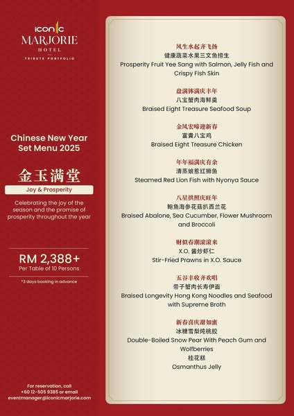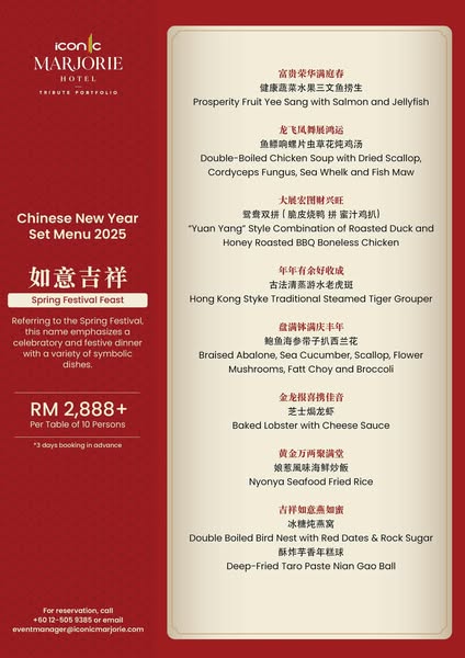 搜索关键词 Reunion Dinner, Iconic Marjorie, Chinese New Year, Family Dinner, Hotel Dining, Malaysia Promotion, Festive Celebration, Special Offer, Restaurant Promotion, Luxury Dining优势 Luxurious setting,Delectable 8-course menu,Lucky draws,Special corkage rate,Complimentary parking
