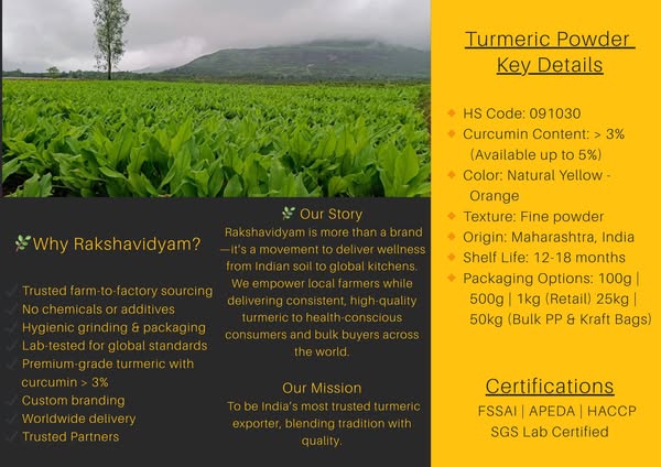 Whether you're sourcing for nutraceuticals, culinary blends, or private labeling, RakshaVidyam is your certified partner in premium turmeric supply.