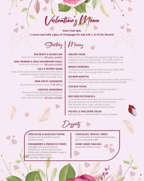 搜索关键词 valentine dinner, romantic dinner, La Turka Northwich, valentines day menu, champagne dinner, best Valentine’s restaurant, Valentines special offer, romantic Valentine’s dinner near me, valentines dinner northwich, valentine special优势 Romantic atmosphere,Special Valentine's Day menu,Champagne included,Reasonable price for special meal