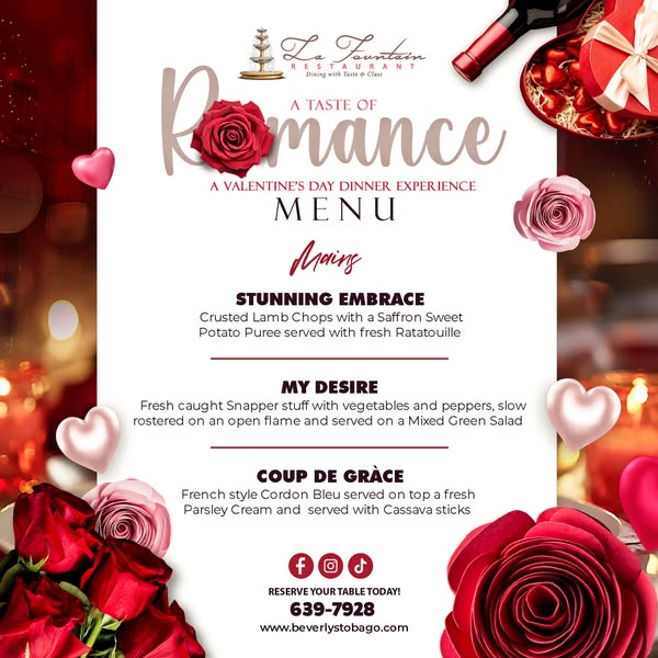 搜索关键词 Valentine's Day Dinner, Romantic Dinner Tobago, Beverly Oasis Suites, La Fountain Restaurant, Tobago Restaurant, Trinidad and Tobago Valentine's, Romantic Getaway, Fine Dining Experience, Valentine's Promotion, Couple's Dinner优势 Four-course gourmet dinner,Romantic ambiance with live music,Bespoke cocktails and fine wine selection,Complimentary keepsake