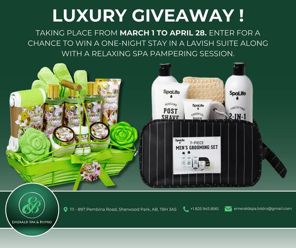 搜索关键词 spa getaway, restaurant package, executive suite, sherwood park, romantic getaway, emerald spa, bistro gift certificate, luxury spa, weekend escape, Alberta spa优势 Luxurious Executive Suite,Gift basket from Emerald Spa & Bistro,Gift certificate for Emerald Spa & Bistro,High perceived value ($625+)