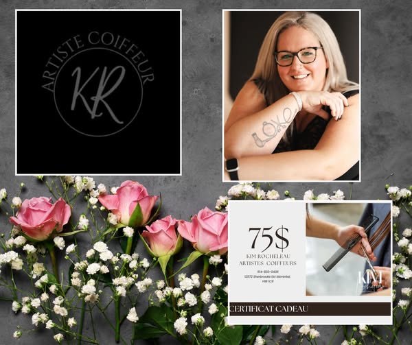 Un certificat cadeau de 75$ de Kim Rocheleau coiffure échangeable contre une coupe, une coloration, ou des produits. 💇♀️