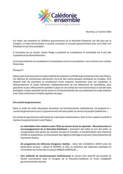 Pour Calédonie Ensemble, il est indispensable que le gouvernement de la Nouvelle-Calédonie entre en fonction le plus rapidement possible.