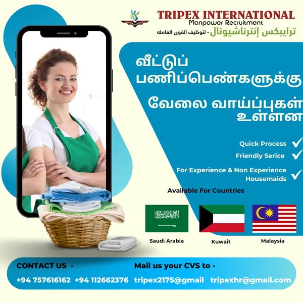 எங்கள் நிறுவனத்தால் சவூதி அரேபியா 🇸🇦, குவைத் 🇰🇼, மற்றும் மலேசியா 🇲🇾 ஆகிய நாடுகளுக்கு வீட்டு வேலைக்கு பெண்கள் ஆட்சேர்ப்பு செய்யப்படுகிறார்கள். உடனடி வேலை, சிறந்த சம்பளம், இலவச உணவு, உறைவிடம் மற்றும் பல நன்மைகள்!