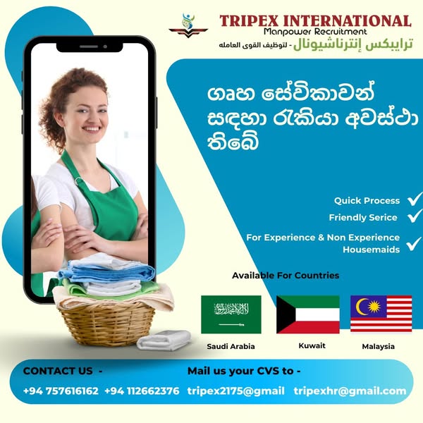 අපි දැනට සවුදි අරාබිය 🇸🇦, කුවේට් 🇰🇼, සහ මැලේසියාව 🇲🇾 සඳහා ගෘහ සේවිකාවන් බඳවා ගනු ලැබේ. ආකර්ෂණීය වැටුප්, නවාතැන්, ආහාර, සහ වෙනත් පහසුකම් ලබාදේ.