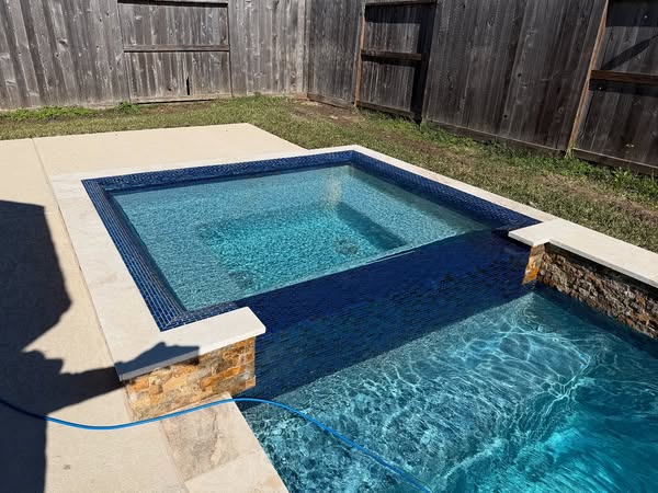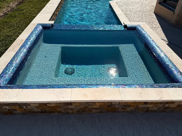 Checkout this unique custom pool with a raised spa and oversized tile spillway. 💦