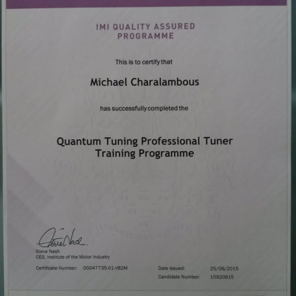 IMI Certified #QuantumTuning Professional Tuner. JMC Power Automotive Ltd is Proud to announce that Now has a certified IMI (Institute of Motor Industry) Quantum Tuning Professional Tuner ! We are probably the only company in Cyprus that has IMI Professional Certified remapping Technician with experience in tuning programming since 1993 !! "I am a professionally qualified remapping technician, certified by the IMI which is the Institute of the Motor Industry. What this means to you is that I have undergone a unique program of training and certification through Quantum tuning and am now qualified to remap you vehicle. • Only Quantum trained remapping technicians are independently qualified and certified by the IMI, which is the Institute of the Motor Industry. It is the only recognized remapping qualification of its type within the motor trade. • When you are having your vehicle remapped, you don’t want to get it wrong. Making a mistake can be expensive and inconvenient, so insist on a suitably qualified professional remapping technician that has been certified by the IMI, the Institute of the Motor Industry.