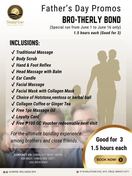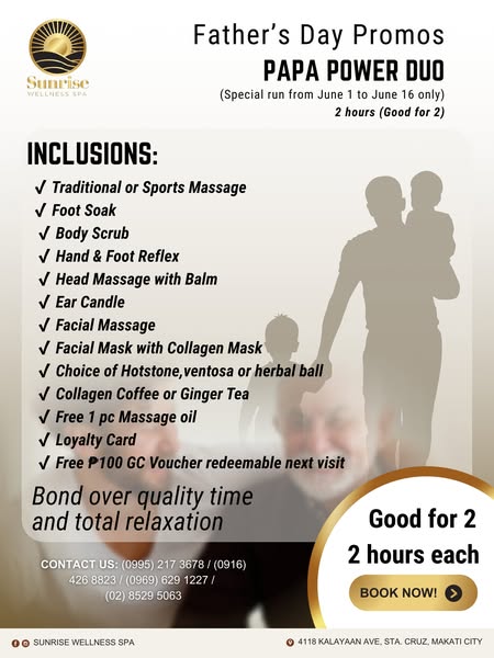 搜索关键词 Father's Day Spa, Spa Promos, Massage Makati, Home Service Spa, Wellness for Men, Relaxation Gifts, Spa Specials, Sunrise Wellness, Rainy Season Relaxation, Spa Day for Dad优势 Extended Spa Promos,Perfect for Father's Day,Suitable for solo, couples, or groups,Home Service Available,Open 24/7