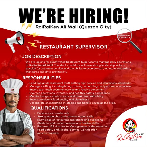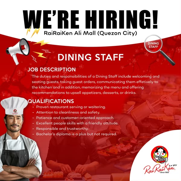 搜索关键词 restaurant job, food service, customer service, rairaiken ali mall, hiring restaurant优势 Opportunity to work with a passionate team,Focus on great food,Emphasis on excellent customer service