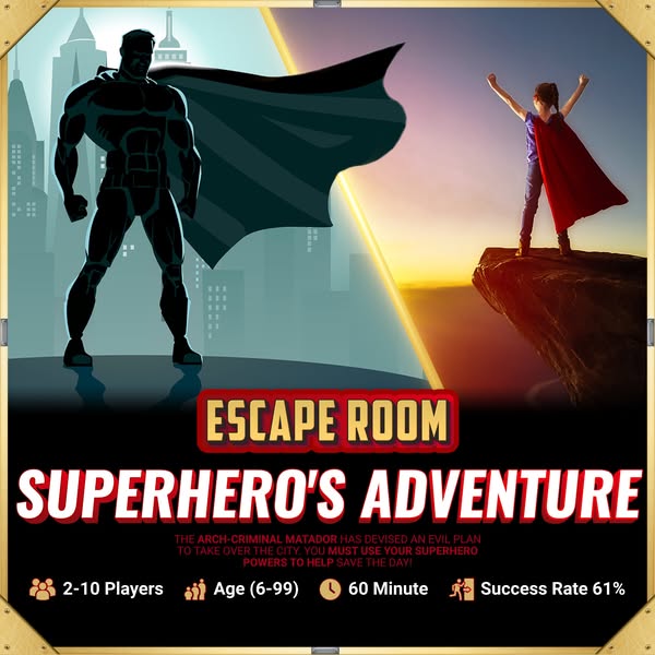 搜索关键词 Escape room games, Adventure entertainment, Family fun activities, Interactive group games, Sixty minute escape, Escape normal life, Be the hero, Fun with friends, Kids activities, Recreational escape games优势 Fun interactive entertainment,Suitable for various groups (friends, family, etc.),Escape from everyday life