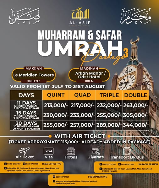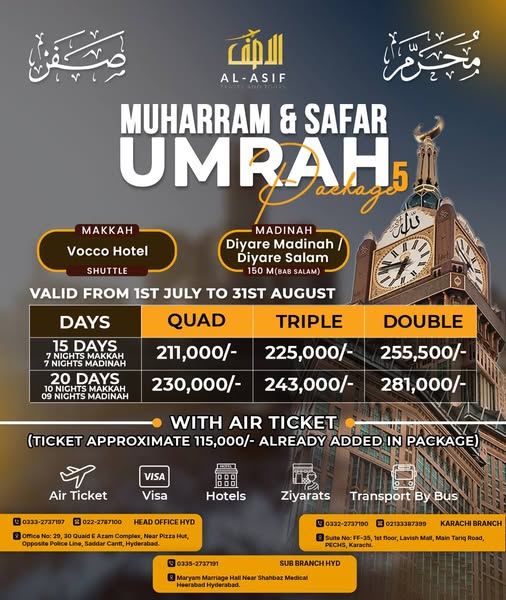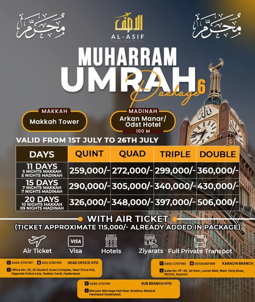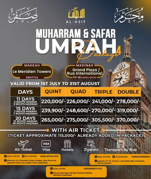 搜索关键词 Umrah packages 2025, Muharram Umrah, Affordable Umrah, Makkah Madinah travel, Al Asif Travel Tours, Religious travel packages, Pakistan Umrah, Islamic tours, Group Umrah travel, Umrah Visa included优势 Comprehensive packages (air ticket, visa, transport, hotel),Ziarats in Makkah & Madinah included,Choice of duration (11, 15, 20 days),Reliable and peaceful experience