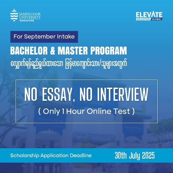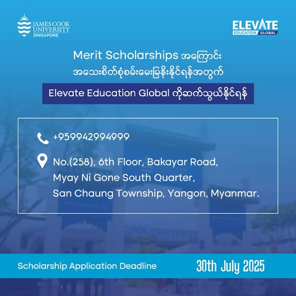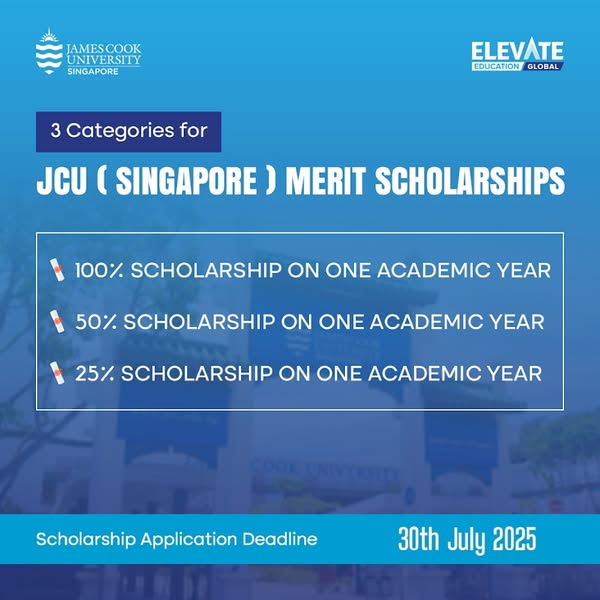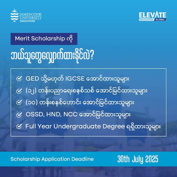𝐉𝐚𝐦𝐞𝐬 𝐂𝐨𝐨𝐤 𝐔𝐧𝐢𝐯𝐞𝐫𝐬𝐢𝐭𝐲 𝐒𝐢𝐧𝐠𝐚𝐩𝐨𝐫𝐞 တွင် လာမယ့် 𝟐𝟎𝟐𝟓 𝐒𝐞𝐩𝐭𝐞𝐦𝐛𝐞𝐫 𝐈𝐧𝐭𝐚𝐤𝐞 အတွက် ကျောင်းစရိတ်သက်သာခွင့်( 𝐎𝐧𝐞 𝐀𝐜𝐚𝐝𝐞𝐦𝐢𝐜 𝐘𝐞𝐚𝐫) အတွက် 𝟐𝟓%, 𝟓𝟎% မှ 𝟏𝟎𝟎% အထိပေးအပ်သွားမယ့် 𝐌𝐞𝐫𝐢𝐭 𝐒𝐜𝐡𝐨𝐥𝐚𝐫𝐬𝐡𝐢𝐩𝐬 ကို ယခု 𝐌𝐚𝐲 လ ကနေ စတင်လျှောက်ထားလို့ရနေပြီပဲဖြစ်ပါတယ်။