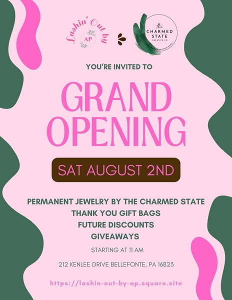 搜索关键词 grand opening, lash extensions, permanent jewelry, beauty services, local business, giveaway, discounts, beauty salon, thecharmedstate, lashin.outbyap优势 Grand opening discounts and giveaways,Multiple chances to win prizes,Support local business,Early bird discounts for first guests