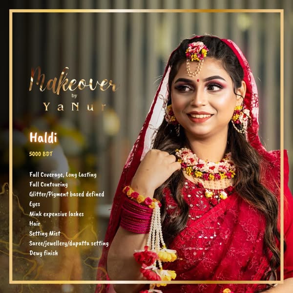 搜索关键词 bridal makeup Dhaka, home makeup service, affordable bridal makeover, wedding makeup Dhaka, flawless bridal look, Makeover by Yanur, bridal glow, makeup artist Dhaka, wedding services, special day makeup优势 Affordable packages,Convenient home service,Customized bridal looks