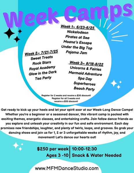 搜索关键词 summer camp, dance studio, kids activities, early registration, summer fun, dance classes, February 12th, MFMD Dance Studio, summer programs, children's camp优势 Variety of options,Emphasis on early registration