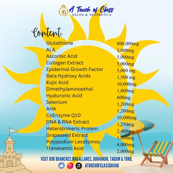 搜索关键词 Glowta Drip, skin whitening, beauty treatment, Davao salon, affordable beauty, youthful skin, aesthetic clinic, skin glow, summer promo, Philippine beauty优势 Brighter, fresher & younger-looking skin,Helps reduce signs of aging,More energy, less fatigue,Stronger immune system,Helps detox & boost liver health,Better sleep & mood,Affordable price (₱244)