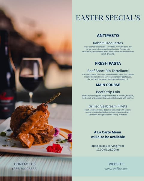 搜索关键词 Easter specials, Restaurant deals, Foodie delight, Easter menu, Antipasto pasta, Delicious main courses, Holiday dining, Restaurant promotion, A la carte selections, Flavorful feast优势 Exquisite Antipasto,Freshly made Pasta,Delightful Main Courses,A la carte selections
