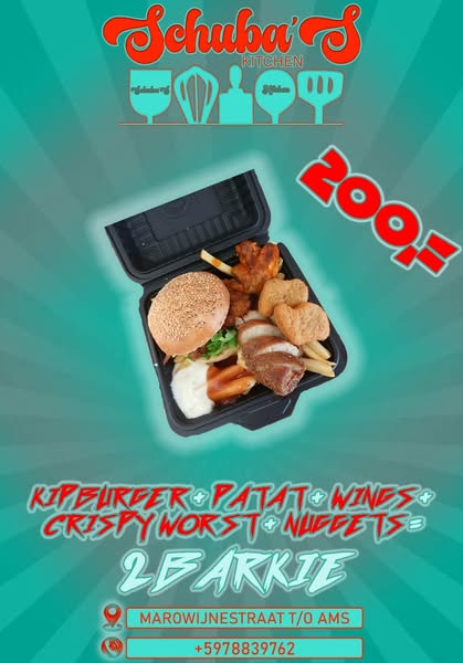 搜索关键词 fast food deals, Suriname food, chicken burger combo, Schubas Kitchen, Paramaribo food, affordable meals, combo offers, Suriname fast food, local restaurant, best chicken taco优势 Affordable pricing,Variety of choices,Convenient location