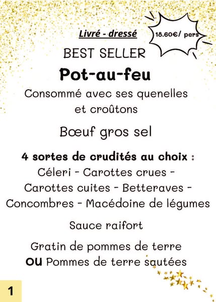 Composez votre offre sur mesure grâce aux options que nous vous proposons : menus de fêtes ou traditionnels, desserts, pains, boissons, service ou non ... De quoi vous faire plaisir avec des prix définis spécialement pour vous ! 😉