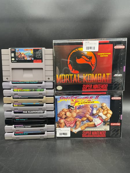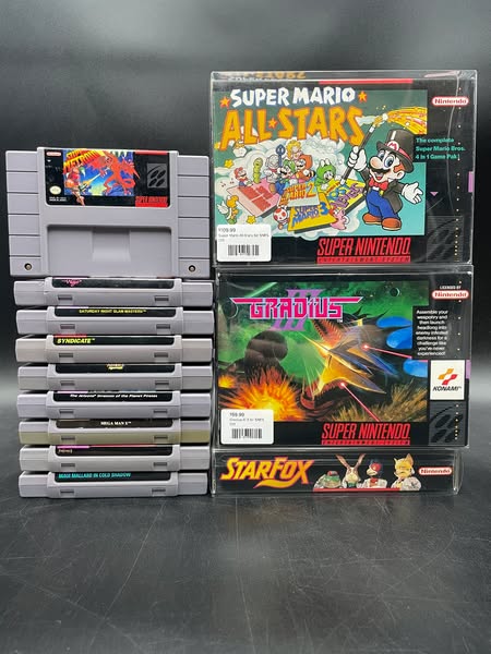 SNES - Super Mario All Stars CIB, Mortal Kombat CIB, and Super Metroid.