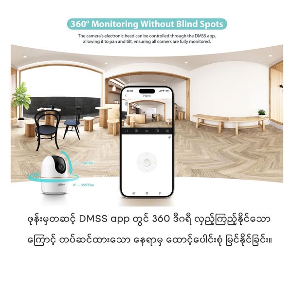 ✅ ဖုန်းမှတဆင့် DMSS app တွင် 360 ဒီဂရီ လှည့်ကြည့်နိုင်သောကြောင့် တပ်ဆင်ထားသော နေရာမှ ထောင့်ပေါင်းစုံ မြင်နိုင်ခြင်း။