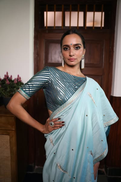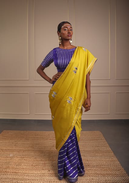 Unleash your vibrant personality with this eclectic silk mul saree, featuring a strikingly unique color combination that’s sure to turn heads. Adorned with hand-embroidered gold sequin flowers, this saree brings a touch of sparkle and elegance to your ensemble.