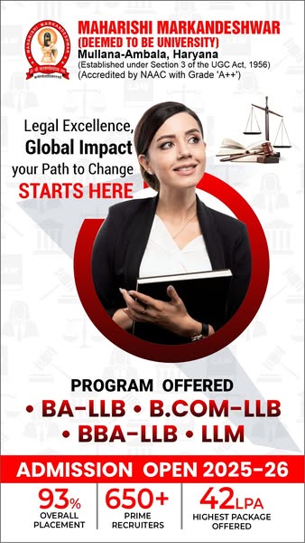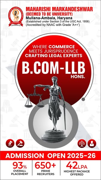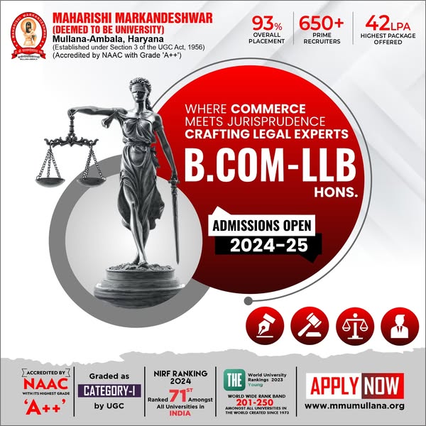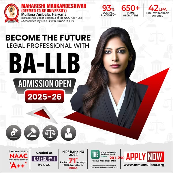 ⚖️ Admissions Open – BALLB | BCom LLB | BBA LLB @ MMDU Mullana Shape your future as a legal leader with India’s top-ranked university! 🏆 NAAC A++ | NIRF 71 in India 💼 93% Placement | ₹42 LPA Highest Package Why Choose Law @ MMDU? ✅ Interdisciplinary Legal Education ✅ Practical Training through Moot Courts & Internships ✅ Experienced Faculty & Legal Experts ✅ Recruiters from Top Law Firms & Corporates #LawAdmissions #BALLB #BBALLB #BComLLB #MMDULaw #NAACAPlusPlus #NIRF71 #93PercentPlacement #LawCareer #Admissions2025