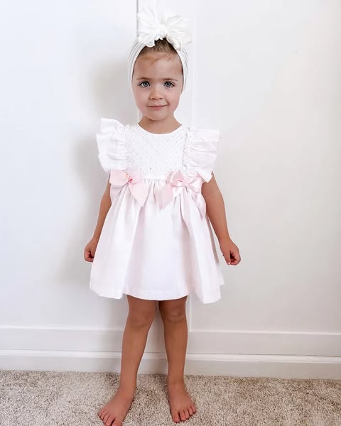 Made in Spain this stunning dress is perfect for special occasions. Pretty Spanish lace trim and a pink satin bow add elegance. This dress comes with matching bloomers underneath.