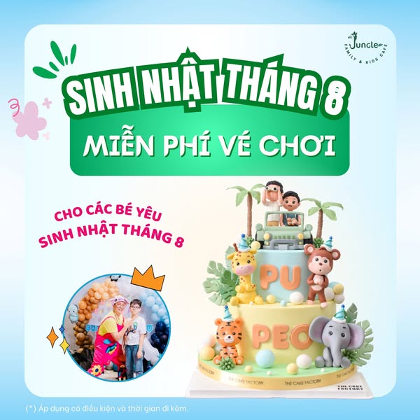 🎂 Sinh Nhật Tháng 8: Miễn phí vé chơi cho bé có sinh nhật tháng 8 (Áp dụng cho đặt tiệc từ 10 bé trở lên).