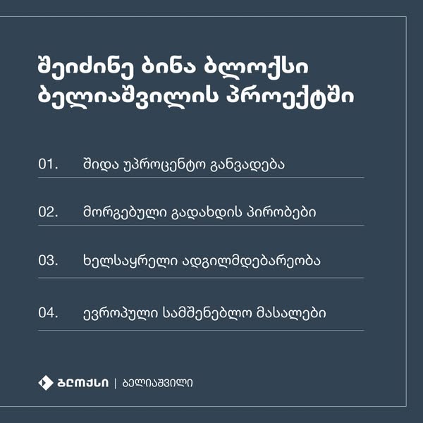 搜索关键词 Apartment for sale, Tbilisi apartment, Blox Beliashvili, Real estate Georgia, Interest free installment, New apartment, European quality, Buy apartment, Apartment project, Georgia property优势 Interest-free installment plan,Convenient location,Customized payment terms,European building materials