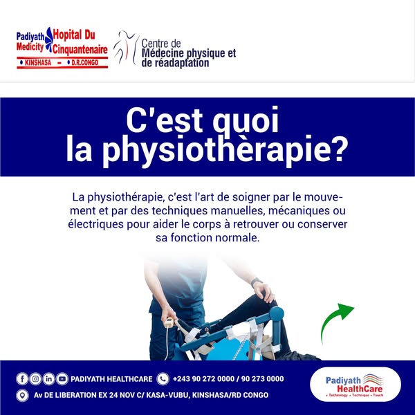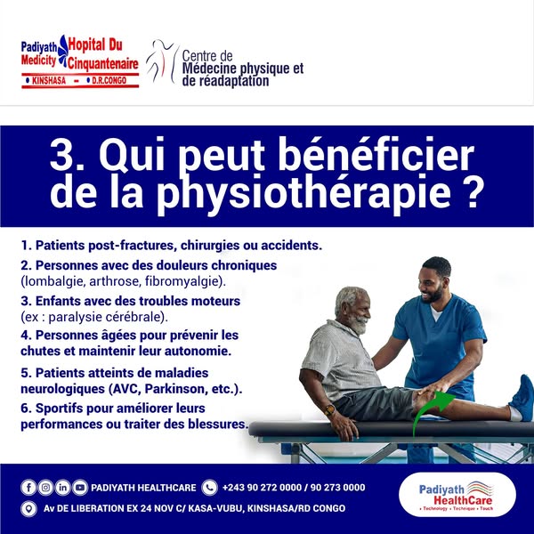 搜索关键词 Kinshasa physiotherapy, rehabilitation services, physiotherapy benefits, Hôpital du Cinquantenaire, movement therapy, post operative recovery, stroke rehabilitation, accident physiotherapy, congo healthcare, physical therapy services优势 Relieves pain,Restores physical function,Improves quality of life,Addresses various conditions (accidents, stroke, etc.)