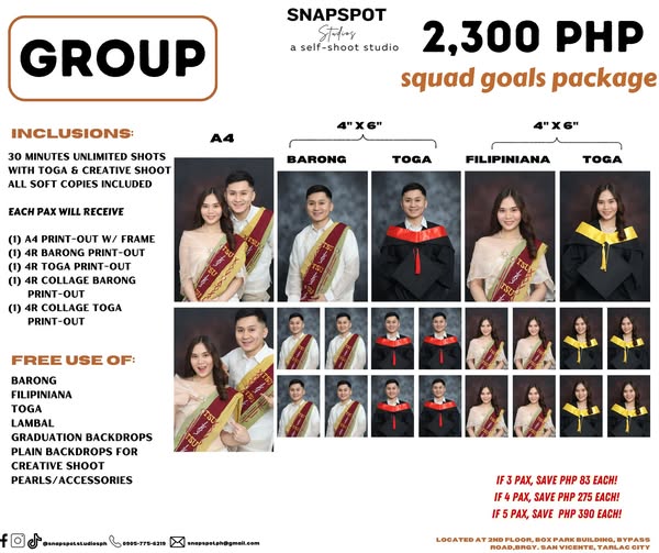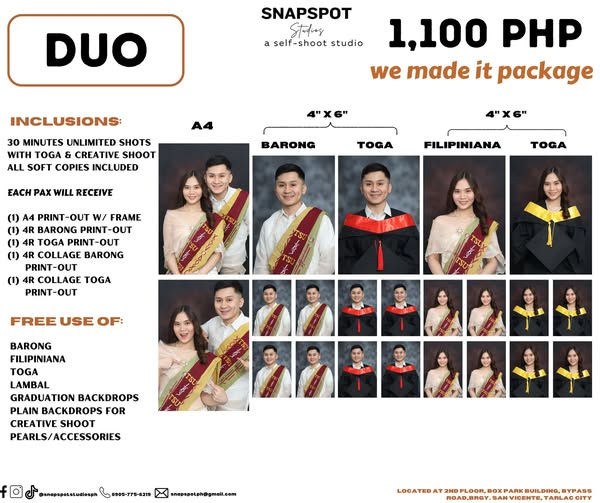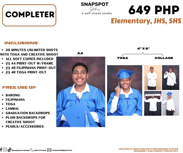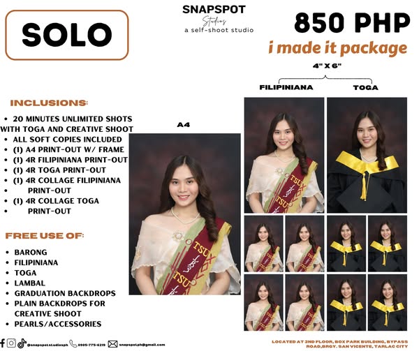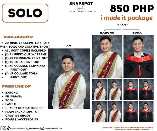 搜索关键词 graduation photoshoot, affordable graduation photos, self shoot studio, Tarlac City photography, DIY graduation photoshoot, graduation attire rental, Tarlac graduation photos, budget graduation package, graduation memories, graduation backdrop优势 Affordable pricing,No photographer needed,Free use of graduation attire,Various backdrops available
