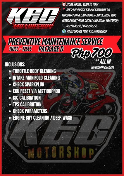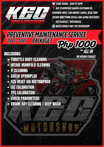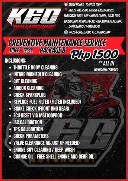 搜索关键词 motorcycle repair, motorcycle service, kec motorshop, cvt cleaning, engine overhaul, performance parts, metro manila motorcycle repair, cainta motorcycle repair, motorcycle maintenance, floodway motorcycle shop优势 Wide range of services (CVT Cleaning, Engine Overhaul, etc.),Offers performance parts and accessories,Long operating hours (10am to 10pm),Multiple contact options (phone, map directions)