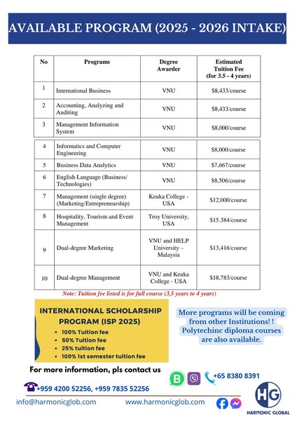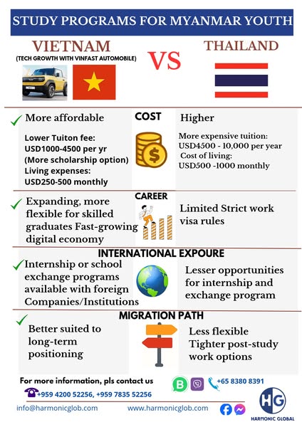 搜索关键词 study in vietnam, vietnam university, education consultancy, scholarships for myanmar students, international degrees, affordable education, student pass vietnam, harmonic global优势 Affordable cost of living and tuition,Easy Student Pass acquisition,Scholarship opportunities,Internationally recognized degrees,Job opportunities in Vietnam's growing economy,Connections to Western universities for postgraduate studies
