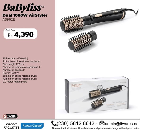 搜索关键词 Babyliss hair clipper, Babyliss curling tong, Babyliss dryer, hair straightener online, hair styler Mauritius, buy hair appliances, free delivery Mauritius, Rogers Capital credit, MCB juice payment, itwares net优势 Wide range of hair styling tools available,Online shopping available,Free delivery,Multiple payment options (cash, MCB Juice, Rogers Capital Credit),Shipping to Rodrigues available
