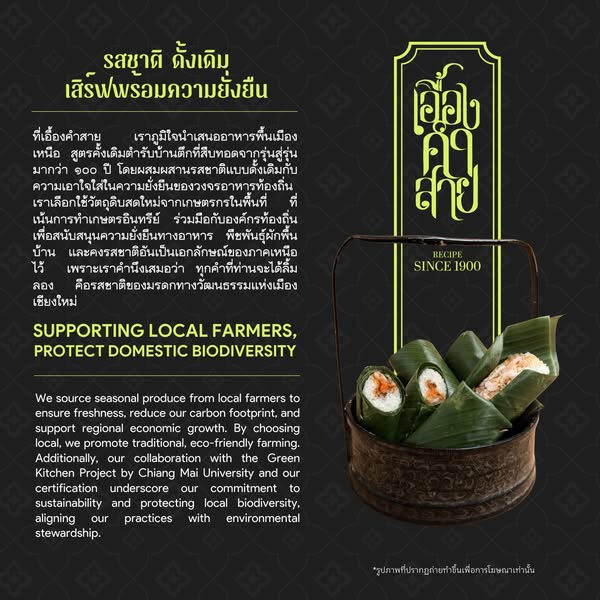 Baan Tuek was built by Luang Anusarnsoonthorn 120 years ago as the first concrete building outside the Chiang Mai city walls. The recipes from Baan Tuek reflect a unique blend of Northern Thai cuisine influenced by diverse cultures from trade with various regions and ethnic groups.