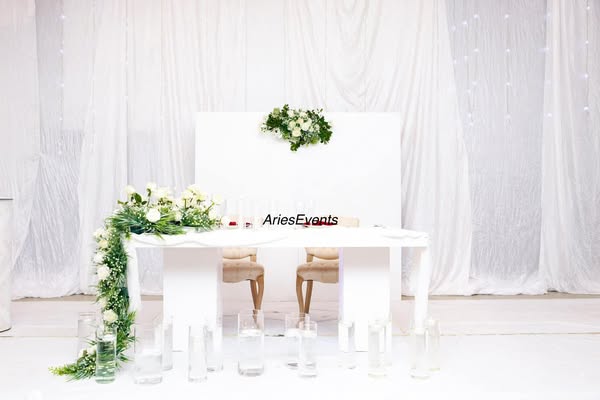 • Color Scheme: All-white décor with a dash of burgundy for a timeless and elegant look.