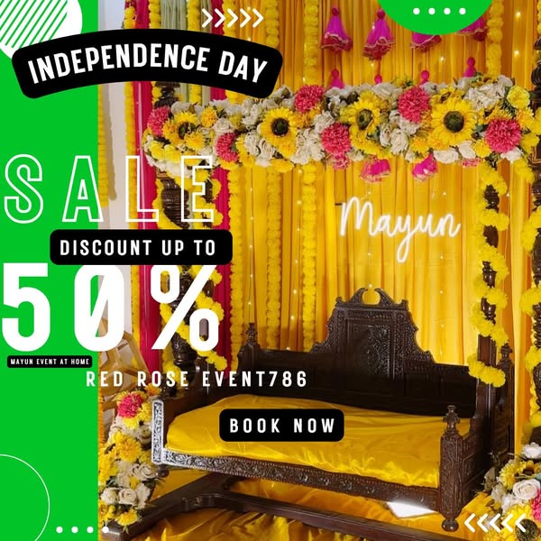 搜索关键词 Wedding Decor Sale, Karachi Event Planner, Home Wedding Setup, Azadi Deals, 14 August Sale, Engagement Decor, Mehndi At Home, Nikah Decor, Wedding Decoration,Pakki Setup优势 Exclusive discounts on wedding decorations,Home event setups,Full professional decoration services,Theme Customization