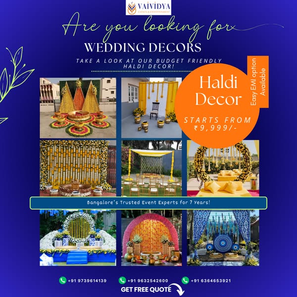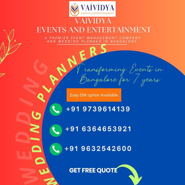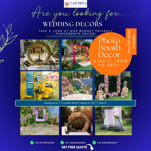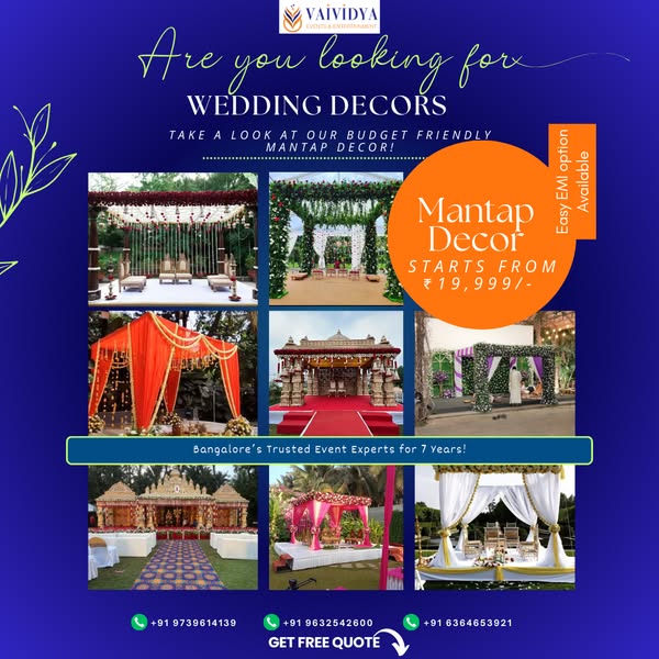 Planning your big day? Let Vaividya Events & Entertainment, Bangalore’s trusted event experts for 7 years, craft the perfect wedding ambiance for you! From elegant floral setups to grand stage designs, we offer stunning & budget-friendly wedding decor.📍 Easy EMI Options Available! 📞 Book Your Wedding Now! Call us at: 📲 +91 9739614139 | +91 9632542600 | +91 6364653921 Let me know if you need any tweaks!